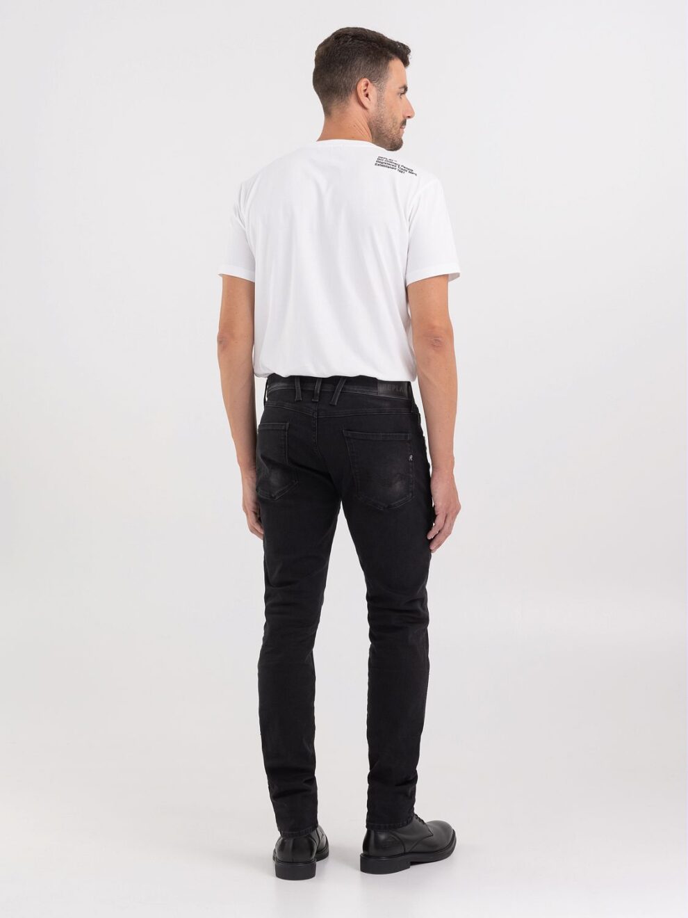 Slim fit jeans with regular fit and tapered leg for a comfort fit. With an authentic look, the garment is made of 11,5 oz 360° recycled Hyperflex reform black cotton denim with a rough wash tone. The five pocket item is characterized by the rinse treatment and by the handmade scrapings which creates contrasting colours on used areas. Zip and button fly.